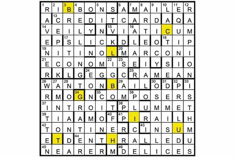 The unclued lights and COMPOSERS (35A) are RIBBONS/Gibbons (1A), MAILER/Mahler (7), RAMEAN/Rameau (25), WANTON/Walton (26A), DELICES/Delibes (46), RAVENER/Tavener (1D), BELLING/Bellini…